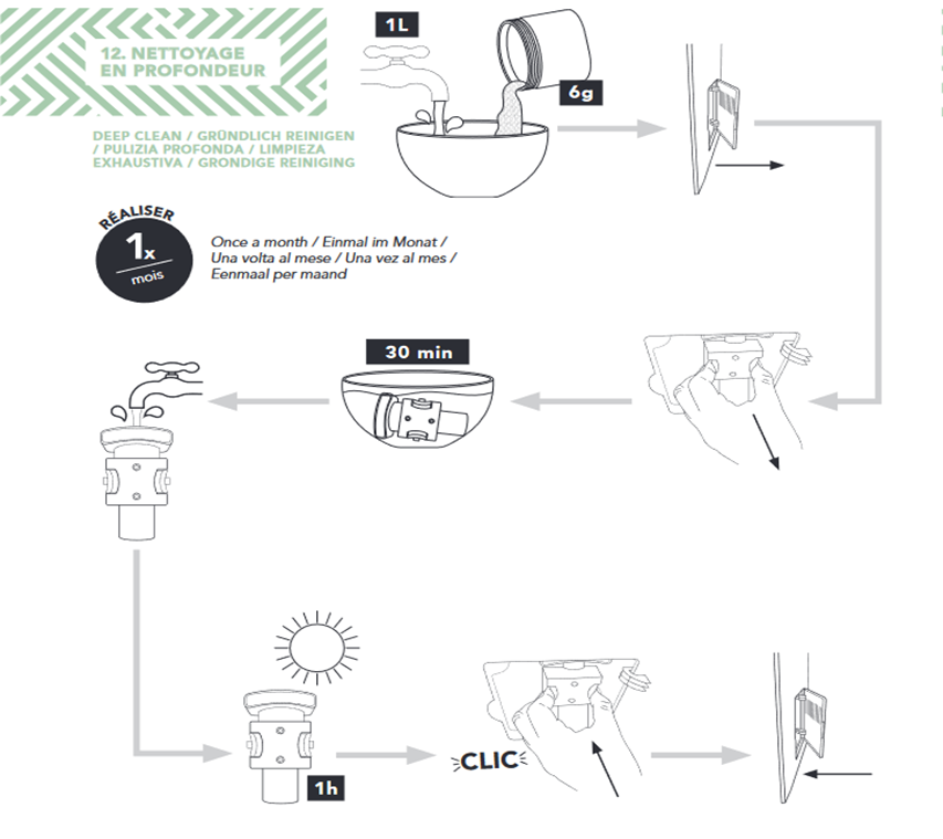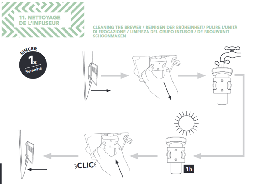 - Chaque semaine : Retirez le groupe et rincez-le à l’eau tiède, sans aucun produit.